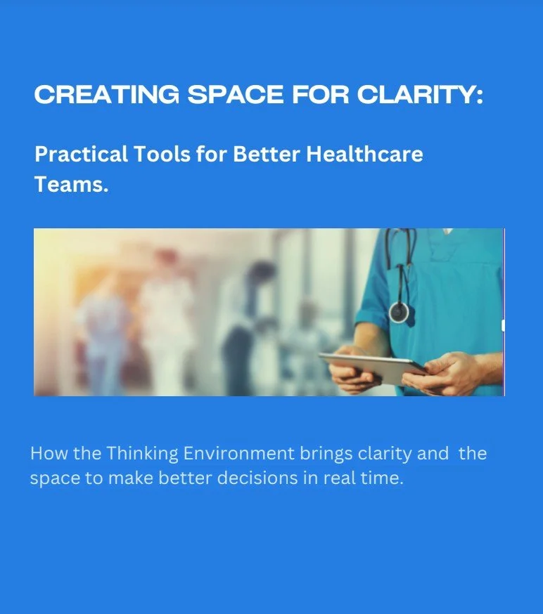 Sign up to our newsletter, for updates about our work and paid programmes. As a thank you we will send you our handout ‘CREATING SPACE FOR CLARITY: Practical Tools for Better Healthcare Teams’ on how the Thinking Environment brings clarity and the space to make better decisions in real time.